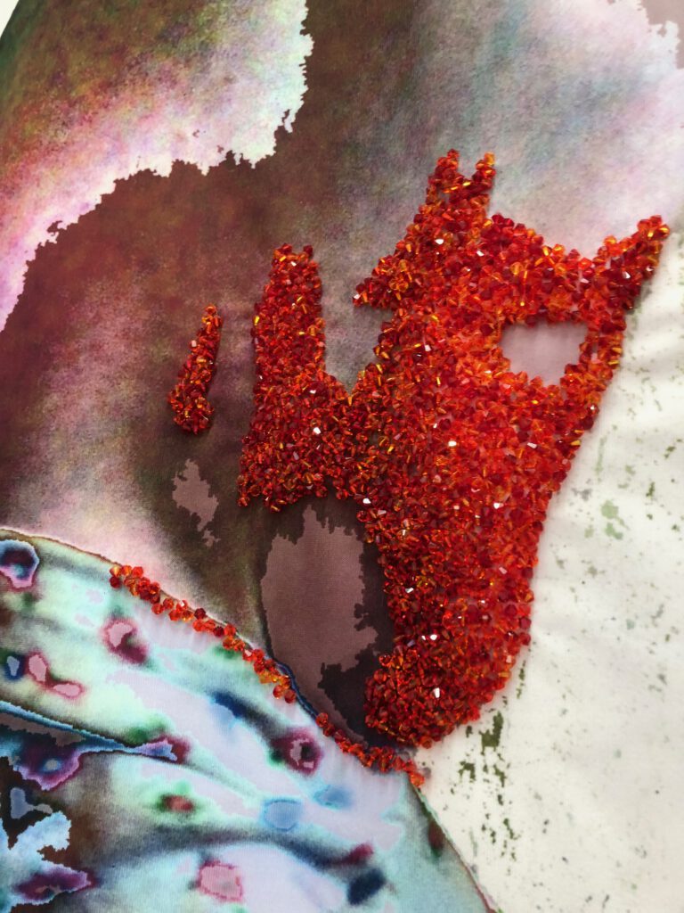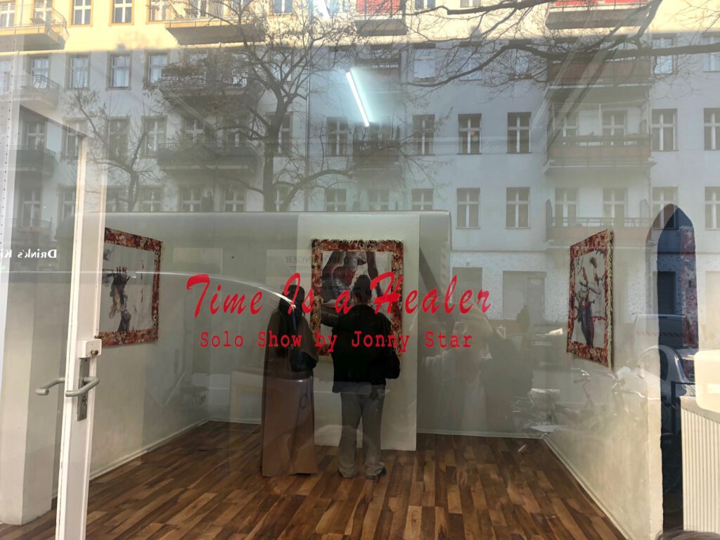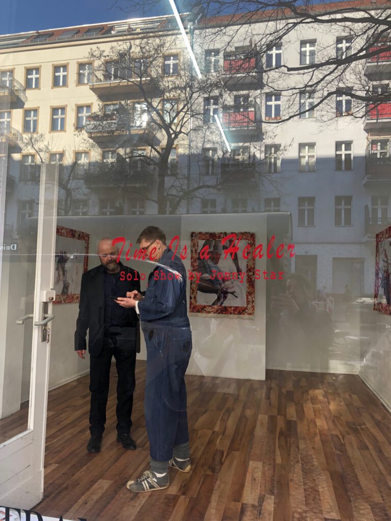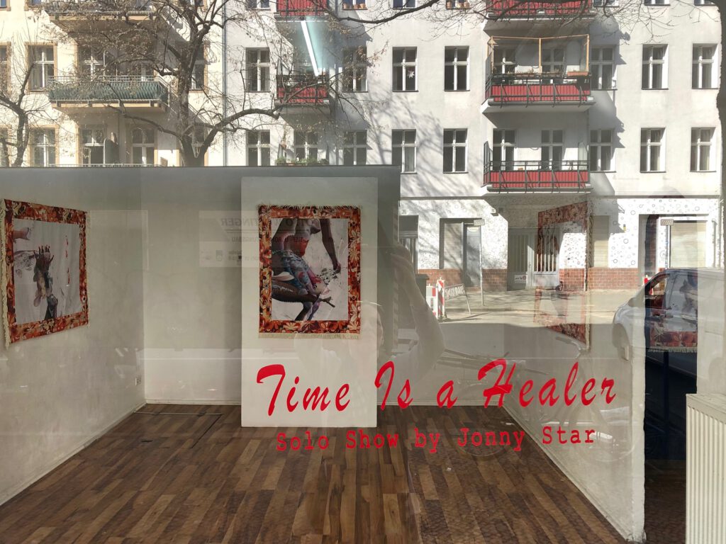 Die Ausstellung Time Is a healer präsentiert zum ersten Mal diese Serie Space mit bedruckten und mit Swarovskiperlen reich bestickten, genähten Wandbehängen, sowie Papierarbeiten, Fotomontagen und Drucke. Begleitet wird die Ausstellung mit vier Texten von vier Autorinnen – vier verschiedene Interpretationen zur dieser Serie von vier Kunsthistorikerinnen, die nach der Anfertigung 2020/2021 geschrieben wurden. Daniela von Damaros, Katia Hermann, Sylvia Sadzinski und Madeleine Schwinge eröffnen uns somit verschiedene Blickwinkel auf die ausdrucksstarke Serie von Jonny Star und entführen uns in den Bildkosmos von Time Is a healer.