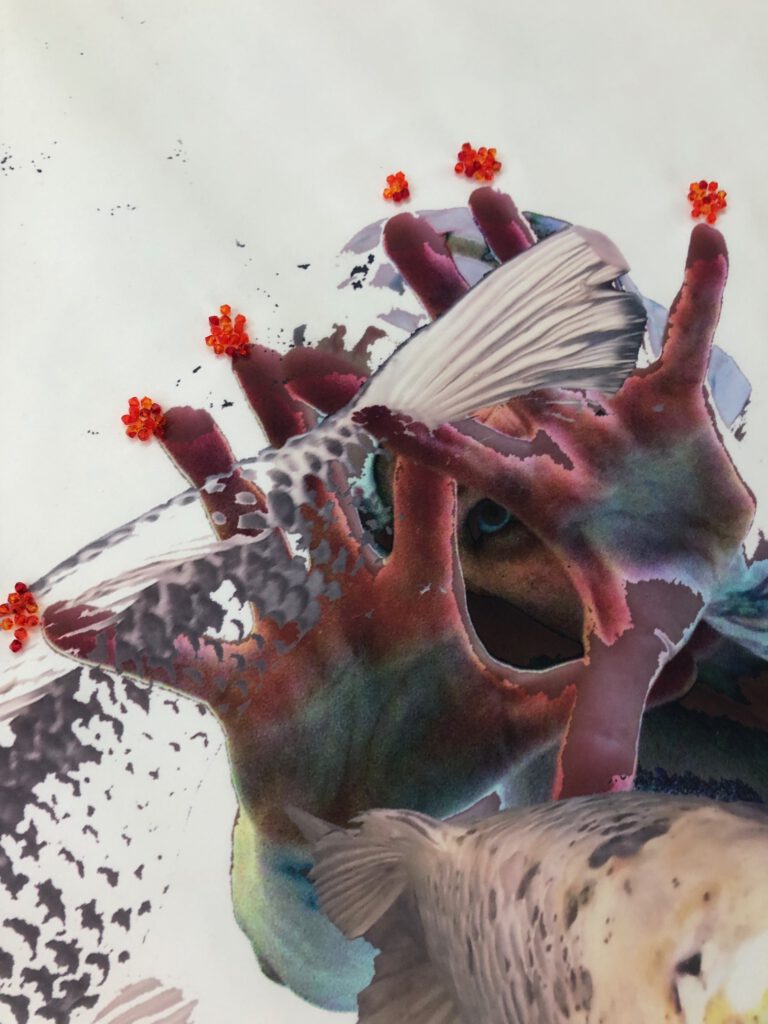 In der Serie von sechs Wandbehängen vereinen sich Mensch und Tier und umgeben sich, sinnlich, zärtlich, in verschiedenen Bewegungen und Positionen zueinander, dynamisch oder ruhig oder scheinen gar zu verschmelzen. In nicht naturgetreuen Größenproportionen zueinander, aber mit farblich schimmernder angepasster Textur der Haut und Schuppen, begegnen sich hier Wesen aus den Elementen Luft und Wasser in einem neuen Element: in einem weißen offenen Raum, der nur durch den Bildrand begrenzt zu sein scheint. Weiß, surreal, traumhaft, unendlich wie das Nichts, der Space. Ein Space ohne Boden, ohne Grenzen, aber gewiss tief, der die Orientierung schwinden lässt, ein nicht bekannter Raum, nicht von dieser Welt, ein himmlischer, göttlicher Raum voller Licht? Oder der Raum im Geiste, des Träumens, des Imaginären, des Unterbewussten, und eventuell ein Ort für Transzendenz, Versöhnung, Heilung und Frieden?