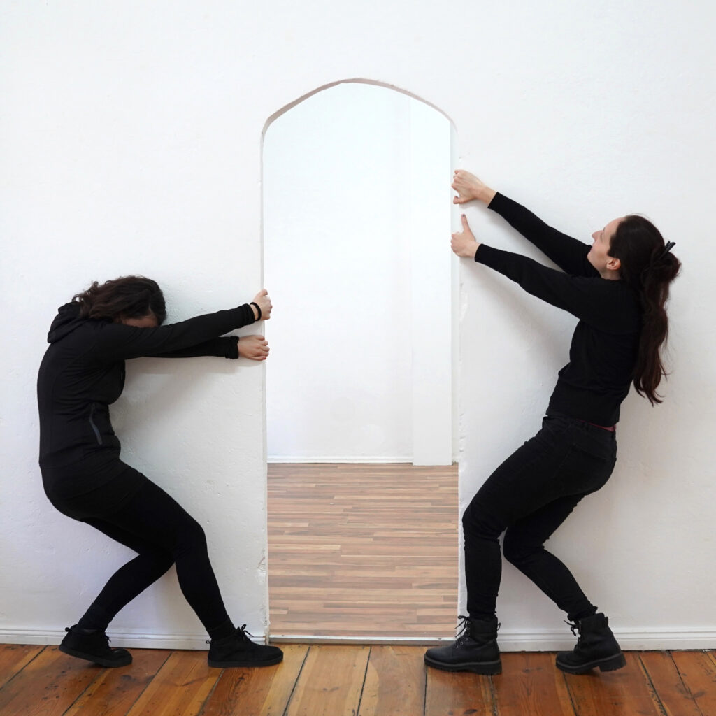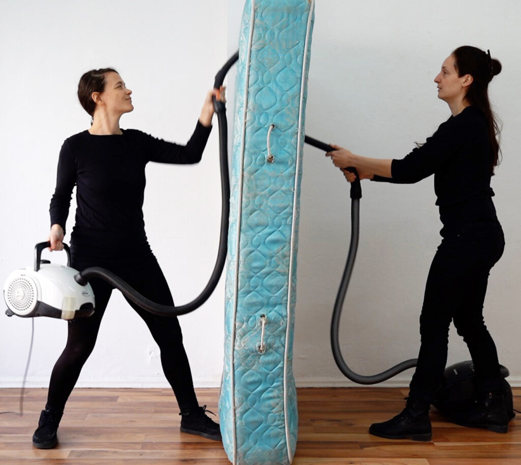 Elma Riza and Laure Catugier, like bad housekeepers, have embarked on a major spring cleaning of the Retramp gallery. They have chosen to use the gallery as a space for their experiments, where objects and actions are inextricably linked through the prism of sabotage. The two artists share a common approach to performance art, which aims at the misappropriation of manufactured objects, with a strong preference for the geometry of forms.